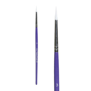 Art Factory Studio Brush - Round #3 comes with white synthetic bristles, ideal for painting thin to thick lines or medium sized tear drops. Applicator with a glazed wooden handle and nickel plated ferrules, is easy to clean after each use. Brush is 7 and 1/2" long. Brush head is 1/16" wide at the base with 5/8" long bristles. Art Factory brushes have synthetic bristles, made without harming any animal in the process.