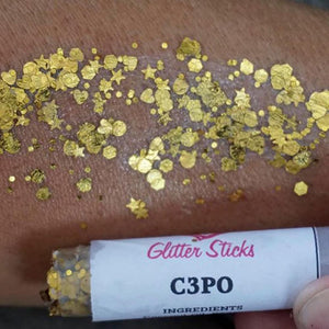 C3PO is a unique blend of multiple shapes and sizes of golden chunky glitter, perfect for sparkling up face and body designs for holidays or parties. Specially designed for Star wars inspired C3PO designs.