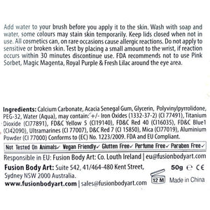 Fusion Body Art Face Paints are made in China, by Australian based Fusion Body Art. Paints are made of US FDA & EU compliant ingredients, free of paraben, gluten, lanolin or perfume. Fusion Body Art Face Paints are hypoallergenic, vegan friendly and safe for use on skin. Fusion Paints are not tested on animals.