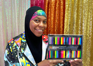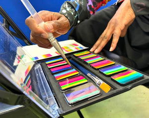 With the Kraze FX Graffiti Split Cake Palette, the possibilities for face painting are endless. Whether for professional gigs or playful parties, the bright and bold color combinations make designs fast, striking, and fun. Kraze FX Tamina Graffiti Palette split cakes are perfect for creating dynamic face paint designs such as vibrant rainbow unicorns, bold superhero masks, mystical mermaid scales, and eye-catching butterfly wings. The seamless blend of neon and bold colors allows artists to quickly craft striking designs like cosmic galaxies, tropical sunsets, and fiery dragons, making this palette ideal for parties, festivals, and events.