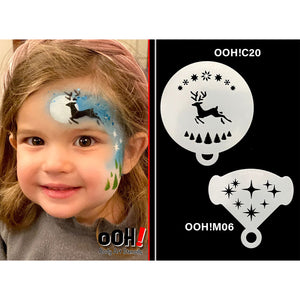 Ooh! Flip Stencil - Reindeer Flip can be used to easily add fun symmetrical design accents to your face and body designs. Ooh! Flip Stencils are symmetrically designed so that they can be flipped to go right around the face avoiding the need for a second stencil to mirror and complete a design.