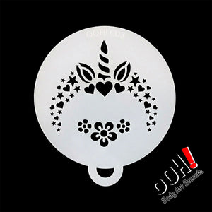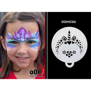 Ooh! Flip Stencil - Unicorn can be used to easily add fun symmetrical design accents to your face and body designs. Ooh! Flip Stencils are symmetrically designed so that they can be flipped to go right around the face avoiding the need for a second stencil to mirror and complete a design.