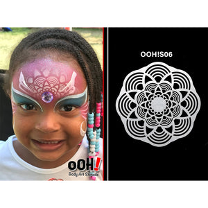 Ooh! Sphere Stencil - Mandala can be used to easily add fun spherical design accents to your face and body designs. Ooh! Sphere Stencils are designed to create design patterns that shrink towards the center of the designleaving a space for a gem in the center.