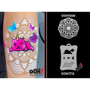 Ooh! Stencils can be used to paint over a face paint base or over bare skin. Hold the stencil firmly on skin, and apply face paint either by using a sponge, brush or airbrush. Ooh! Stencils also work great with rainbow cakes to create vibrant designs. Optionally add 3D effects by slightly re-positioning the stencil and reapplying the same design. Mix and match elements in different stencils to create beautiful unique accents.