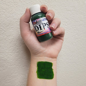 ProAiir Evergreen DIPS Waterproof Makeup by ShowOffs Body Art is a hybrid, brush-on makeup with a highly pigmented and extremely durable, alcohol based formula. DIPS Makeup can be used for line work over powders, cake makeup, airbrush makeup or directly on skin. ProAiir DIPS Makeup formula is smudge proof and water resistant, that can withstand extreme conditions like rain, waterparks, hot sweaty days, rubbing etc, under which normal cake makeup does not hold up well.