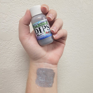 ProAiir Silver Dazzle DIPS Waterproof Makeup by ShowOffs Body Art is a hybrid, brush-on makeup with a highly pigmented and extremely durable, alcohol based formula. DIPS Dazzle colors are ideal for adding shining effects to your designs. Metallic colors tend to fade slightly quicker than regular colors due to weight of metallic pigments. DIPS Makeup can be used for line work over powders, cake makeup, airbrush makeup or directly on skin.