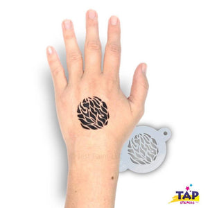 Each TAP Stencil comes with a distinct design, there by making it easy for face painters to apply, without making a decision about which part of the stencil to use. Their comfortable round shape allows for flexibility of applying to any part of your face. TAP Stencils have 2 tabs on the sides, allowing firm positioning during application. Each stencil is approximately 2 to 2 1/4 inches in diameter, with varying design size from stencil to stencil.