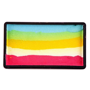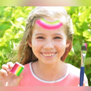 Cameleon Jelly Bean ColorBlock Split Cakes contain different face paint colors arranged side by side that can be picked up easily to create multicolored face paint designs, with just a few strokes. Cameleon ColorBlocks are great for face painting events and parties where several designs need to be created quickly. All you need is a 3/4 inch brush or a suitable sponge such as Cameleon Kabuki sponge.