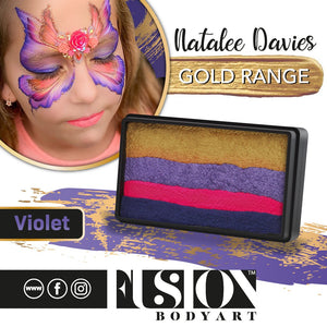 Fusion Body Art Natalee Davies Gold Range Violet Split Cake can be used to create multicolored designs quickly and easily with minimum number of brush strokes. Fusion Body Art Split Cakes are great for painting events, Halloween, cosplay and parties.