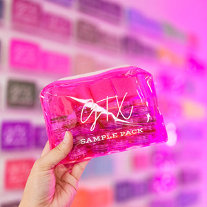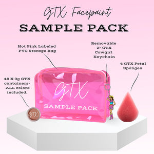 Unleash your creativity with the GTX Sample Pack! This comprehensive set includes 53 containers, each filled with 3g of vibrant GTX face paint, providing ample product to test and swatch various color combinations. The hot pink labeled PVC storage bag ensures your paints stay organized, while the removable 2" GTX cowgirl keychain adds a playful touch. Additionally, the pack includes 4 GTX petal sponges, perfect for achieving smooth and flawless application.