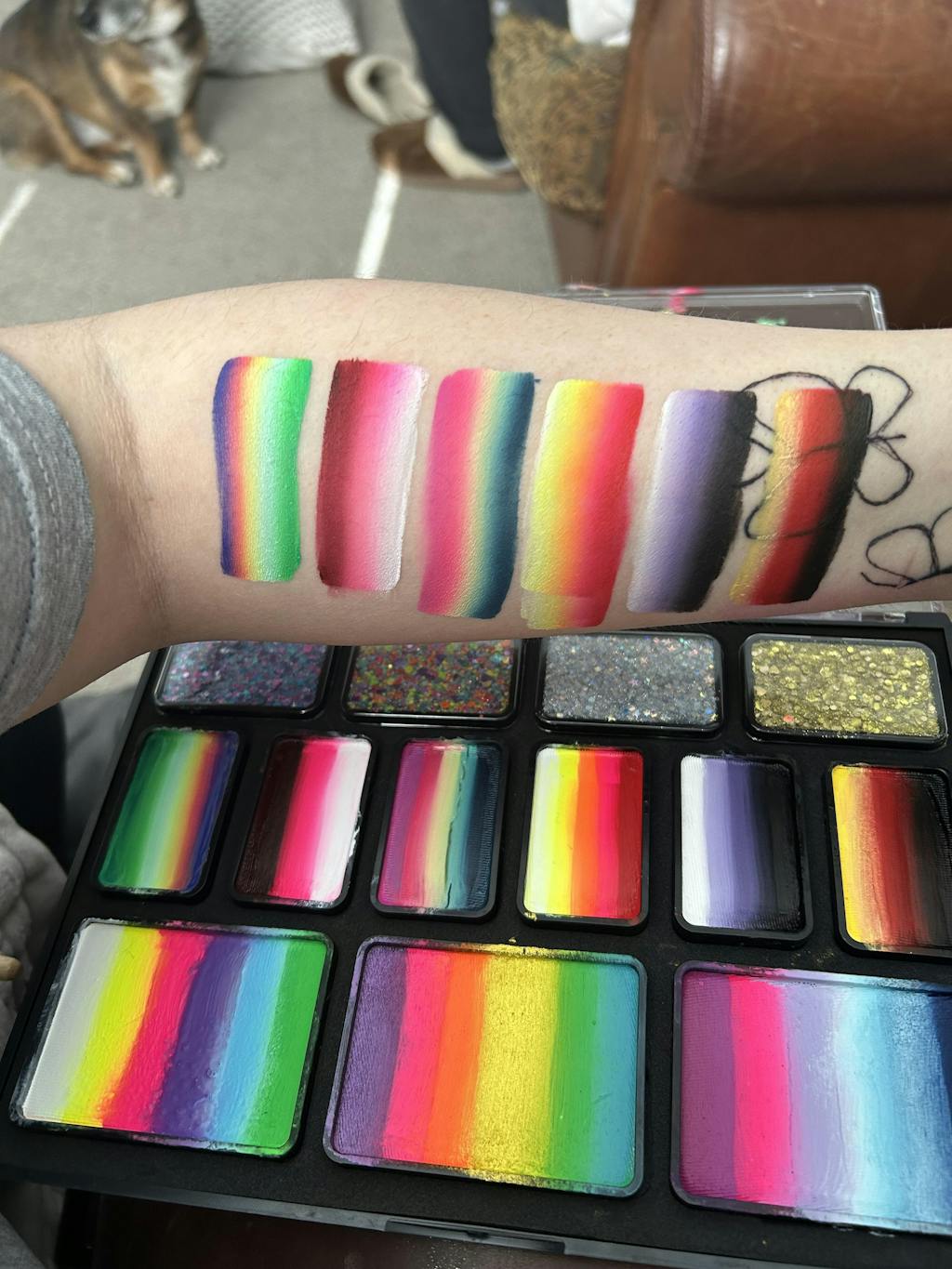 Palette includes the following face paint and glitters: