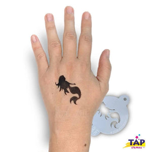 TAP Face Painting Stencil - Mystical Mermaid (091) can be used to add mermaid and fantasy design accents to your face and body designs. TAP Stencils are very easy to use and can be used with face paints, airbrush, powder, temporary tattoo inks or glitter. Made of flexible mylar, TAP Stencils are great to add fun designs on face or arms of adults and children alike.