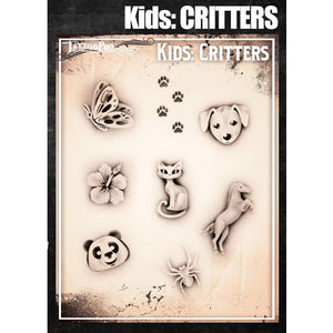Tattoo Pro Kids Series Stencils - Critters Kit contains a special edition airbrush stencil sheet, about 8" x 10" in size, with various kid themed stencil designs including Puppy, Kitty, Butterfly, Flower, Horse, Panda and Spider. Kids Series stencils from Tattoo Pro can be used to spruce up your little one's party.