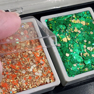 Net Weight 48 gm ( 8 grams per color). 6 removable containers, with 10 gm of glitter. Please note that 10 gm is the size of each jar. The actual weight of the each color combo is approximately 8 gm. Exact glitter weight can vary depending on density of specific particles used, whether it is aloe based or gleam based etc.