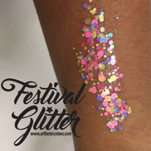 a mix chunky glitter of multiple colors and shapes. Rave Festival Glitter is a great addition to a face painter's kit to produce a range of