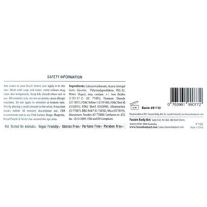 Fusion Body Art Face Paints are made in China, by Australian based Fusion Body Art. Paints are made of US FDA & EU compliant ingredients, free of paraben, gluten, lanolin or perfume. Fusion Body Art Face Paints are hypoallergenic, vegan friendly and safe for use on skin. Fusion Paints are not tested on animals.