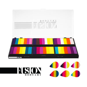 Fusion Body Art Split Cake Palettes are great for painting events, Halloween, cosplay and parties. All split cakes in this palette are made with non neon colors, includes the following cakes: Vivid Butterfly, Berry Butterfly XL, Tangerine Dream, Summer Love, Neon Nirvana XL and Pretty Rainbow.