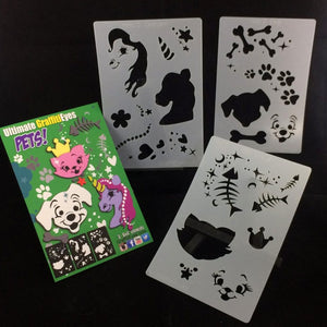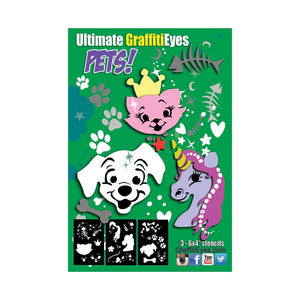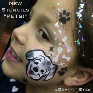 GraffitiEyes Stencil Kit - Pets is a great set of three unique pet themed stencils, each about 4" x 6" in size, perfect for a variety of designs for children. PET Stencil Kit has a dog with paw prints & bones, a cat with fish bones and a unicorn with horns, hearts and stars, designed for perfect fit on foreheads, cheeks, hands or arms. Each stencil kit also includes a step by step instruction card to get you started right away.