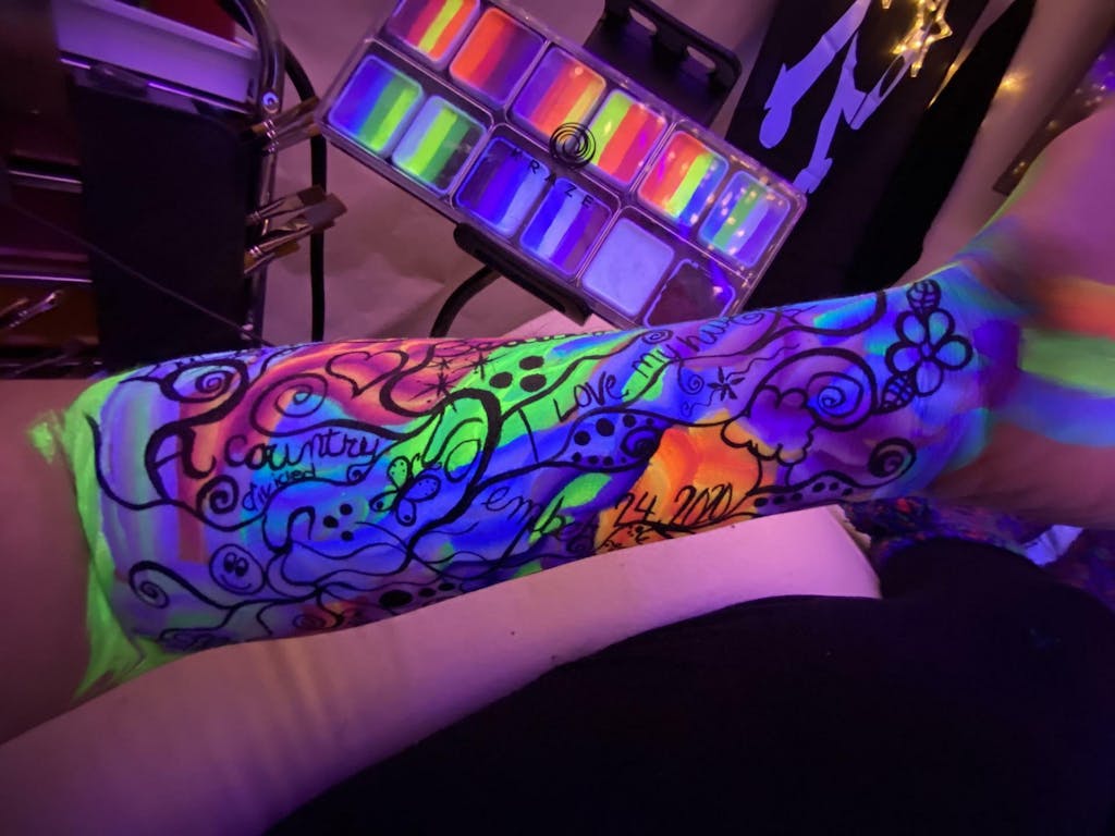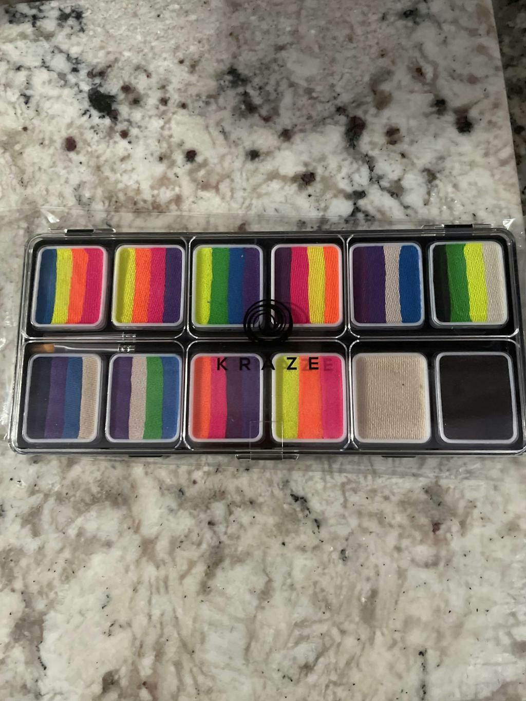 Kraze FX Neon Pop 12 Split Cake Palette contains 12 vibrant One Stroke Split cakes, perfect for creating colorful face and body designs that will pop under neon lights to create amazing effects. Palette measures 7.5" x 3.5" x 0.5" and includes 12 One Stroke Cakes, 6 gm each, and two 1/16" brushes, to get you started right away. One Stroke Cakes can be used to paint colorful designs within seconds, by picking up multiple colors in a single stroke.
