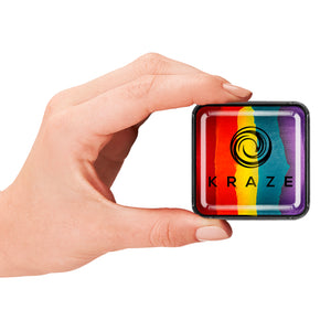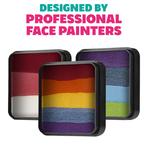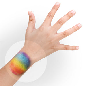 Kraze FX Girly Girl Rainbow Domed Split Cake is an exclusive here at Facepaint.com with following colors: Magenta, Orange, Yellow, Metallic Medium Blue and Purple - great for sunsets, butterflies, tropical designs and more! Comes in 25 gm square container, perfect for creating colorful designs for Halloween, Parties, Schools, Carnivals or Fairs. Also available as 25 gm regular square split cake or 25 gm domed one stroke cake.