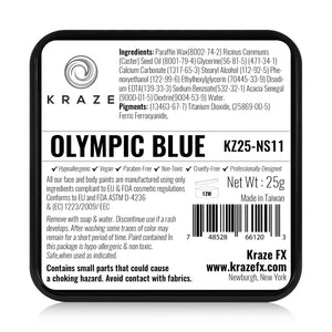 Kraze FX Olympic Blue is a special non staining formula that once removed leaves no traces of paint, compared to some regular blues, which leave light staining after removal. Kraze Non Staining Blues wash off even with just water, and with soap they was off completely leaving no stain at all. Olympic Blue leans towards a warmer shade of blue, not bright or royal blue.
