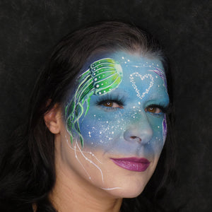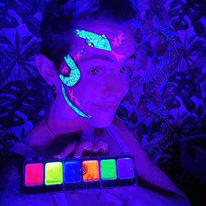 Kraze FX NeonPaint is a wax-based formula with high pigmentation, that works great for amazing effects under blacklight or neon light.Quick drying formula of Kraze is equally good for blending, base work or layering. Wax based formula offers a smooth, solid coverage that will flex with skin movements to last all day without fading or cracking.