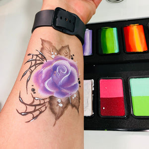 One Stroke Cakes can be used to paint face painting designs within seconds, by picking up multiple colors in a single stroke.