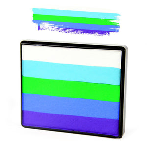 Split Cakes or Rainbow Cakes have changed the dynamics of face painting significantly. Rainbow cakes are cakes with strips of face paint in different colors arranged side by side, allowing you to lay down several colors at once. Split cakes can be used to create colorful designs with just one stroke with a brush or sponge. Rainbow cakes are also great for base work for any design.